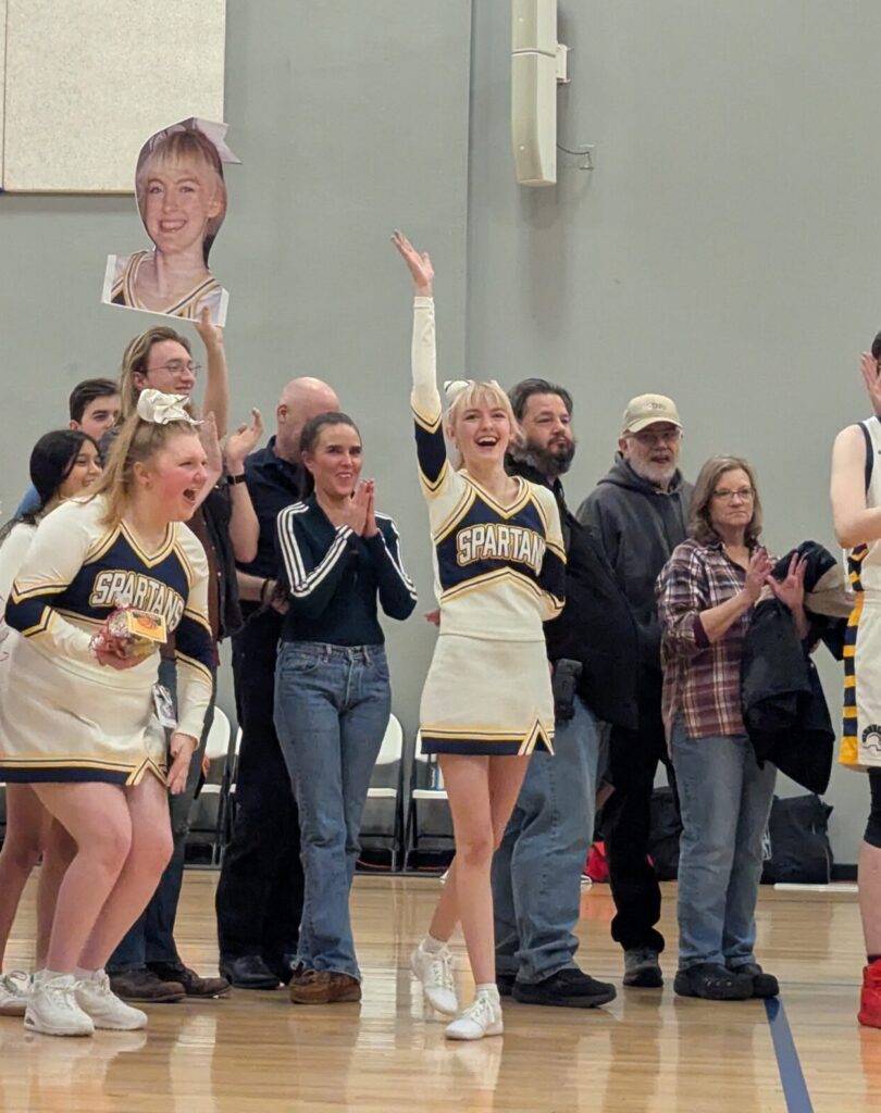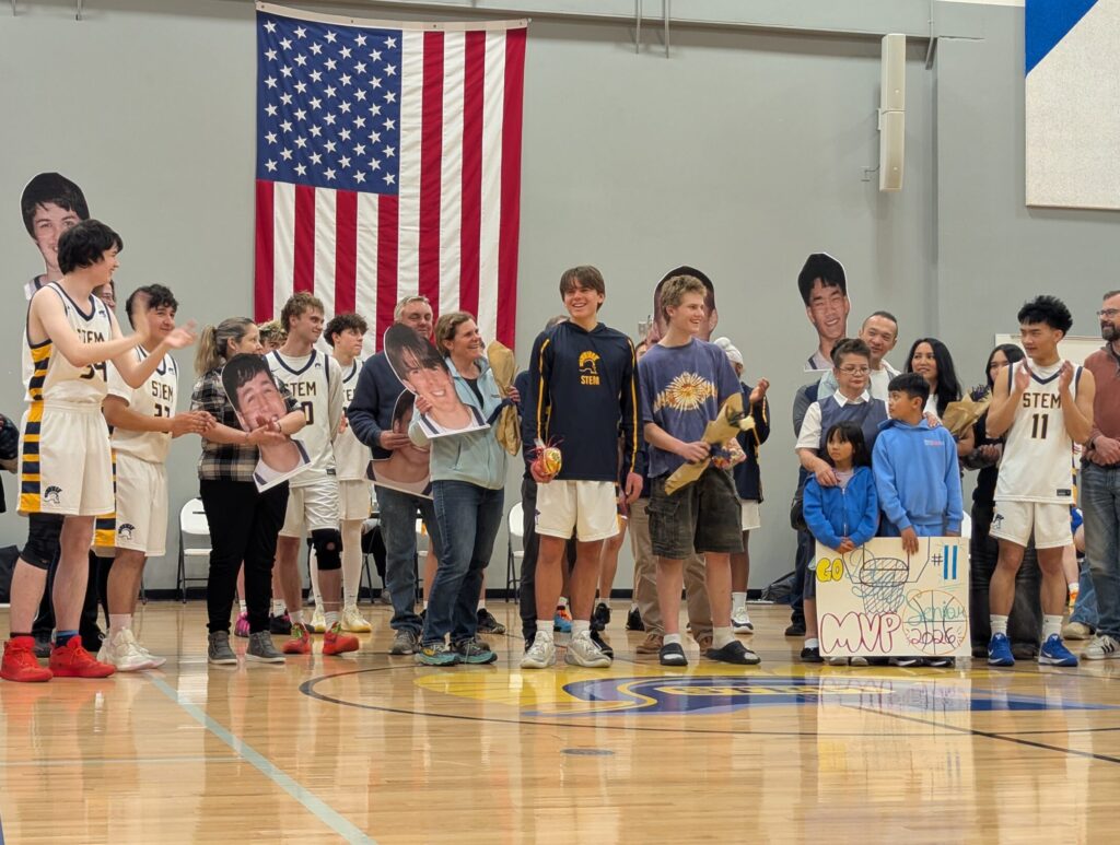 The STEM Spartan community celebrated the seniors on the boys and girls Basketball teams and the Cheer team on Wednesday, February 11. The celebration began by recognizing the 9 seniors from our opponent, Poudre Community Academy, then proceeded to recognize each of STEM’s 9 seniors individually. The Seniors were singled out, not only for their athletic accomplishments, but also their academic, extracurricular, and leadership achievements during their time at STEM. Those in attendance also heard from the seniors regarding their future plans, favorite memories as Spartans, and their advice to underclassmen teammates. The STEM Seniors are: Girls Basketball- Alexis Frey and Lizzy Hegemann; Boys Basketball- Dylan Figueroa, Van Ford-Frier, Ben Yoder, Matt Moore, Deveon Ramirez, and Rayden Neff; Spartan Cheer: Beatrix O’Neill. Congratulations Seniors! While your playing time at STEM is coming to an end, the Spartans will continue to cheer you on in your next endeavors!